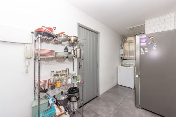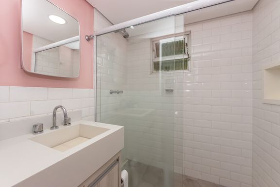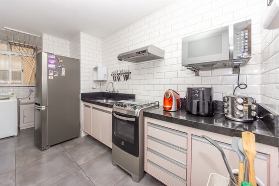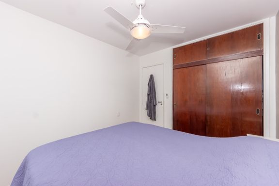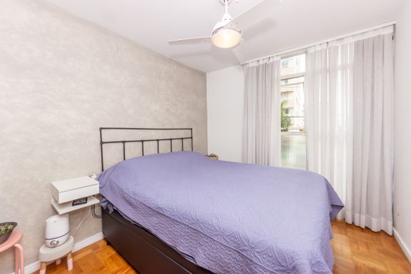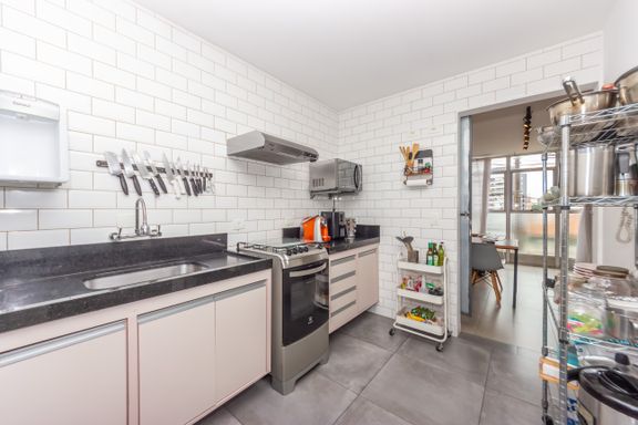 Reformado com bom gosto em 2019, esse apê tem 57 m² (incluindo depósito), 2 dormitórios, 2 banheiros, sala para dois ambientes e uma janela piso-teto que toma quase toda a parede da sala — entra sol, entra luz e dá aquele clima gostoso de fim de tarde com a face oeste.