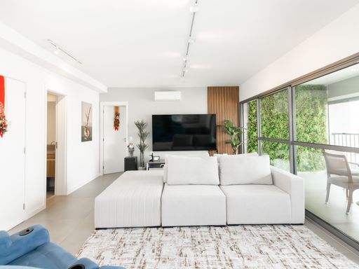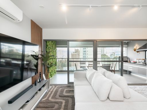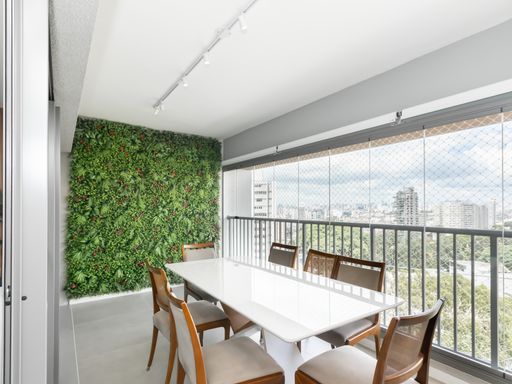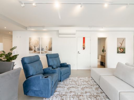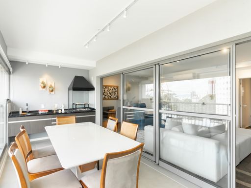 O apartamento possui 3 dormitórios, todos suítes, Sala ampla para 2 ambientes com lavabo, Varanda gourmet com churrasqueira, Cozinha planejada com cooktop e forno, Área de serviço com aquecedor à gás, 4 banheiros no total, Ar-condicionado em todos os ambientes, 2 vagas de garagem e Hall privativo no elevador.