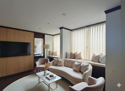 Sala de estar ampla, iluminada e acolhedora.