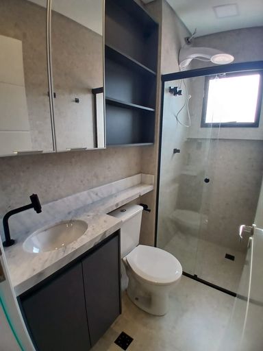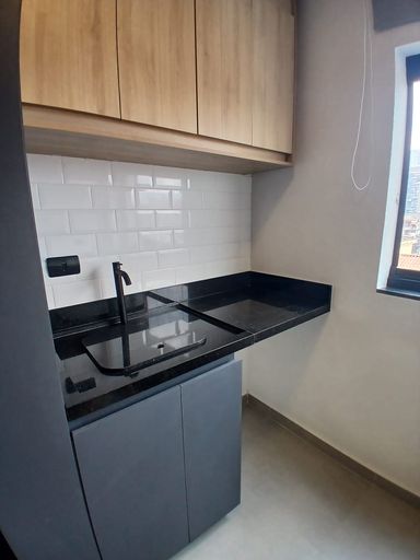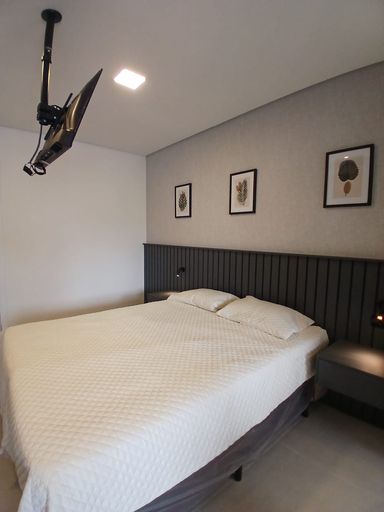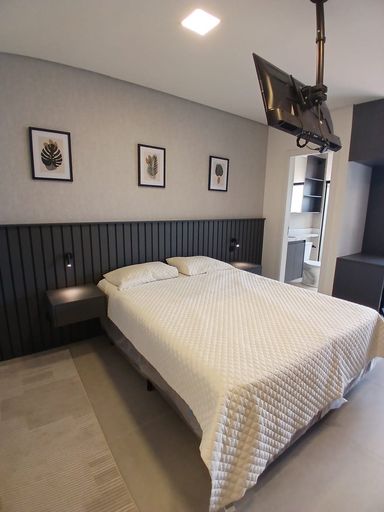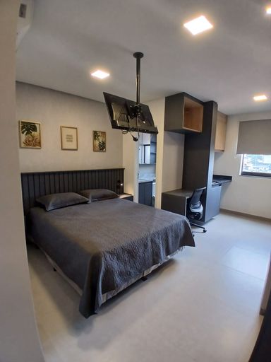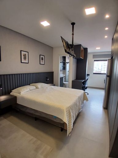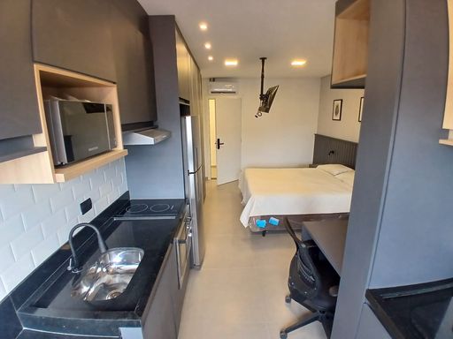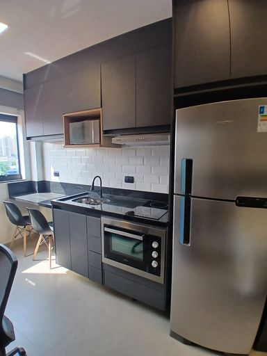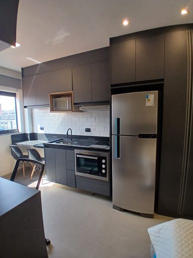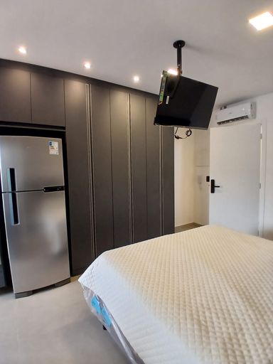 Studio com 35m². Quarto com armários, TV, ar condicionado, cozinha toda equipada com armários, fogão, geladeira, forno, Banheiro com armários. Sem vaga.