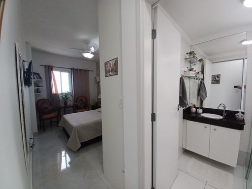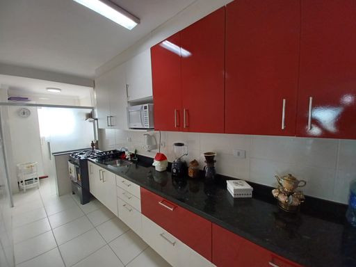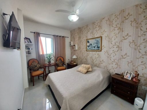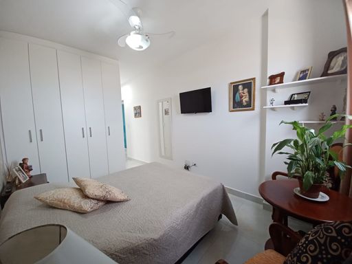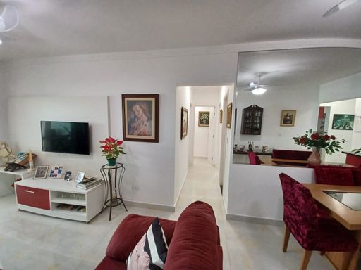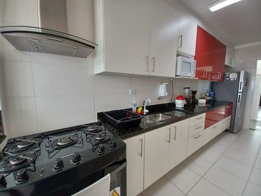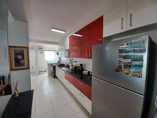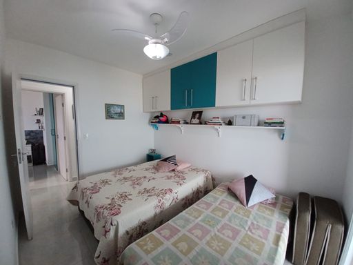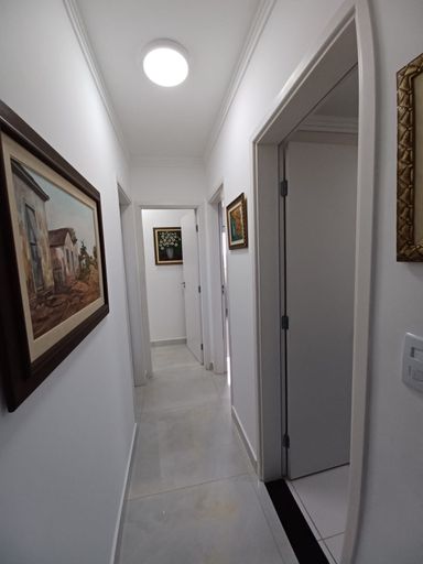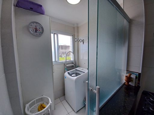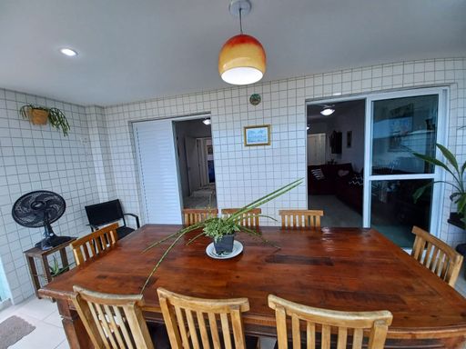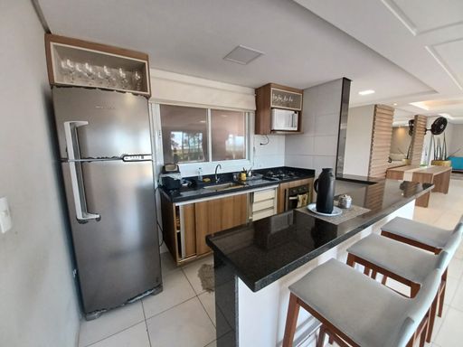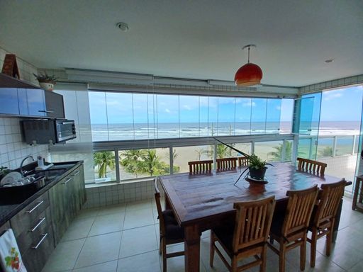 O apto conta com 3 quartos amplos (1 suíte), com armários planejados, 2 banheiros com armários, sala de estar e jantar com vista para o mar, cozinha equipada com armários, lavanderia e
